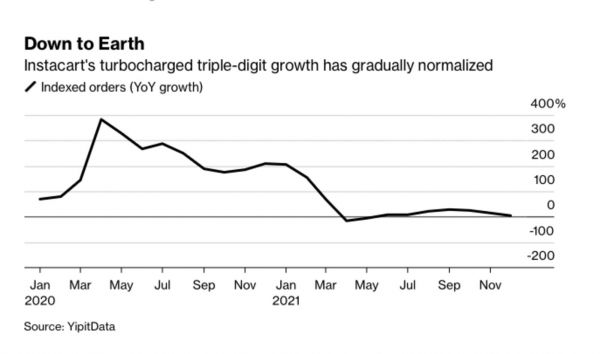 疫情红利结束,通货膨胀飙升,科技类股大跌,那些疫情期间强劲增长的“疫情股”的好日子彻底结束了。而作为其中最具代表性的疫情股,跑腿平台Instacart也经历了残酷落差:不仅业务大幅下滑,连上市都大打折扣了。