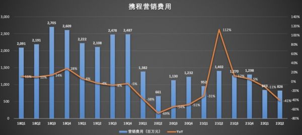 其中,2022年第二季度携程产品研发费用为17.72亿元,同比下降20%,环比下降10%;销售及营销费用为8.26亿元,同比下降41%,环比下降2%;一般及行政费用为6.04亿元,同比下降15%。