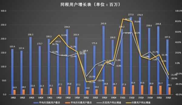 同程旅行净利润跳水,与付费用户规模减少有直接关系。数据显示,2022年二季度,同程平均月付费用户数同比减少22%至2610万,较上一季度的3170万,单季度净流失560万。