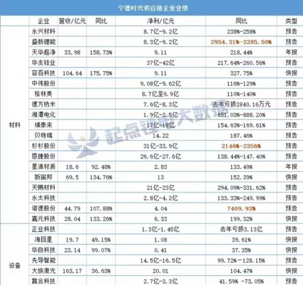 这些企业在宁王的庇佑下,纷纷赚得盆满钵满。公开资料显示,去年,一共有27家宁德时代供应链上市企业披露了自己的业绩快报或者业绩预告,净利皆实现同比大涨,其中,锂电铜箔企业“诺德股份”的净利增速高达7409.93%。