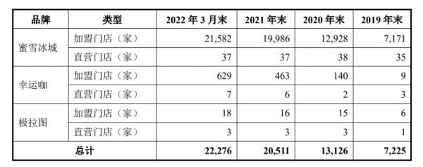截至2022年第一季度,公司已经有22276家门店,其中21619家为蜜雪,636家为幸运咖,21家为极拉图。