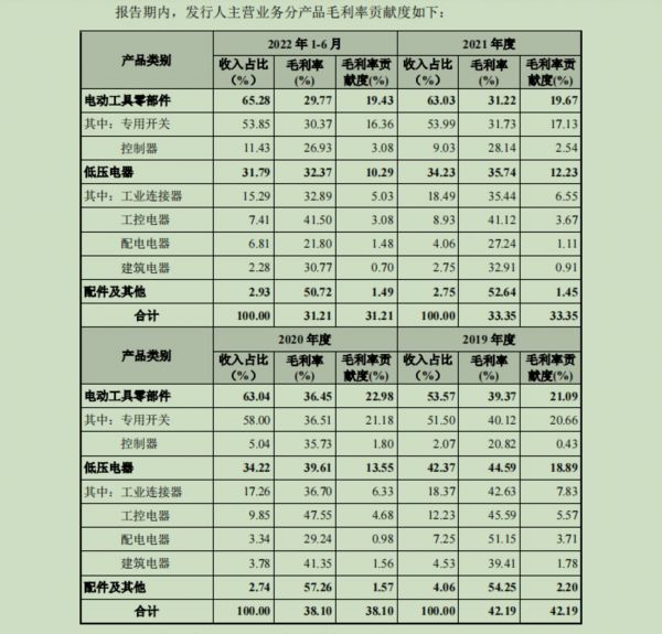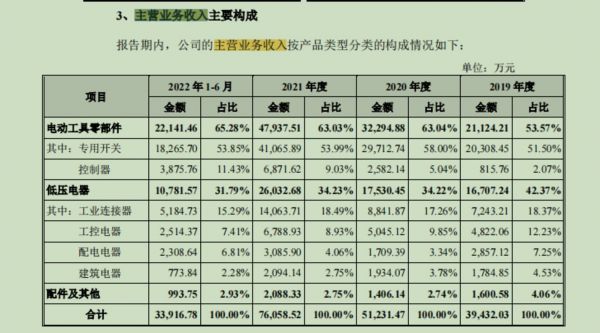 公开资料显示,科都电气专业从事电动工具零部件和低压电器产品的设计、研发、生产和销售,主要产品包括电动工具专用开关、控制器、工业连接器、工控电器、配电电器、建筑电器等。业绩方面,2019年-2021年以及2022年1-6月,科都电气实现的营业收入分别为40349.77万元、52360.37万元、76989.86万元、34726.65万元,对应的归属净利润分别为-4090.47万元、7276.87万元、9316.62万元、3792.37万元。其中,电动工具零部件收入为重要的营收来源,2019年-2021年及2022年1-6月,电动工具零部件收入分别为21124.21万元、32294.88万元、47937.51万元、22141.46万元,占公司主营业务收入比重分别为53.57%、 63.04%、63.03%及65.28%。