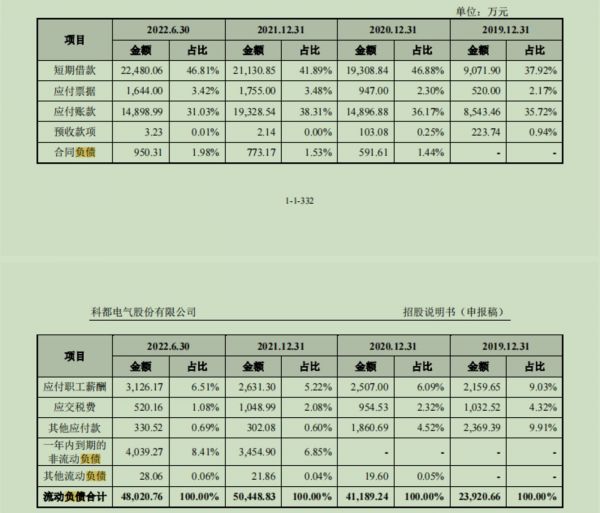 据招股书,报告期各期末,科都电气流动负债占总负债的比重分别为60.25%、82.57%、84.49%及84.41%,公司负债主要为流动负债。截至2022年6月末,科都电气流动负债4.8亿元,其中短期借款约2.25亿元。