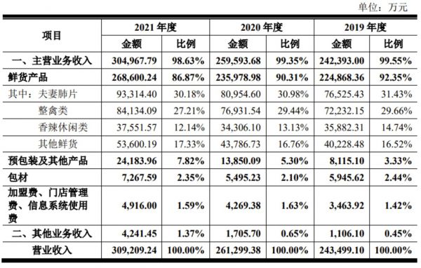 紫燕食品的营收结构以鲜货产品为主,占到九成左右。其中,夫妻肺片是明星爆款,以辣椒、酱油、盐等香料为主,口感麻辣,单这一项产品的营收占比多年来均超30%,相当于去年一年至少营收9亿。因此在上市前,紫燕食品也被业内戏称“夫妻肺片第一股”。