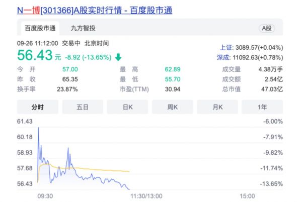 9月26日,一博科技在创业板上市,发行价格确定为65.35元/股,开盘破发,跌12.8%至57元/股;截至发稿前每股56.43元,对应公司总市值为47.03亿元。