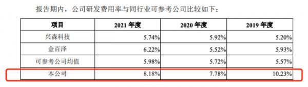 报告期内,公司的研发费用率分别为10.23%、7.78%、8.18%,高于可参考公司的均值5.57%、5.72%、5.98%。