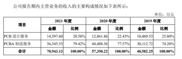 报告期内,其PCB设计服务收入占主营业务收入比重分别为25.80%、22.43%、20.58%,收入占比并不高,并呈逐年下降趋势,其营收来源主要依靠PCBA制造服务业务,报告期内占主营业务的比例分别为74.20%、77.57%、79.42%。