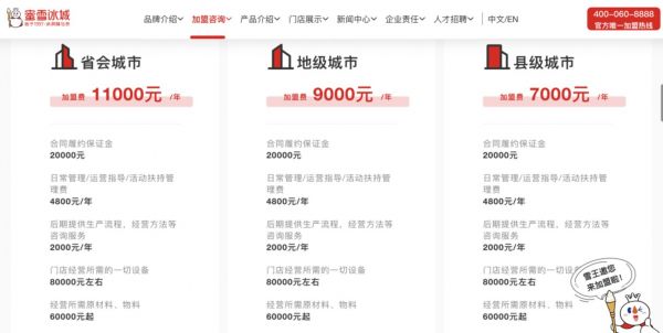 蜜雪冰城官网显示,加盟费用按照城市等级划分开来。县级城市每年收取7000元,地级市9000元,省会城市则是11000元。此外,加盟商开店需要交2万元保证金,8万元左右买设备、8万元左右的装修费用,以及6万元起的原材料采购费用,加盟一家门店前期预计投入在37万元起。