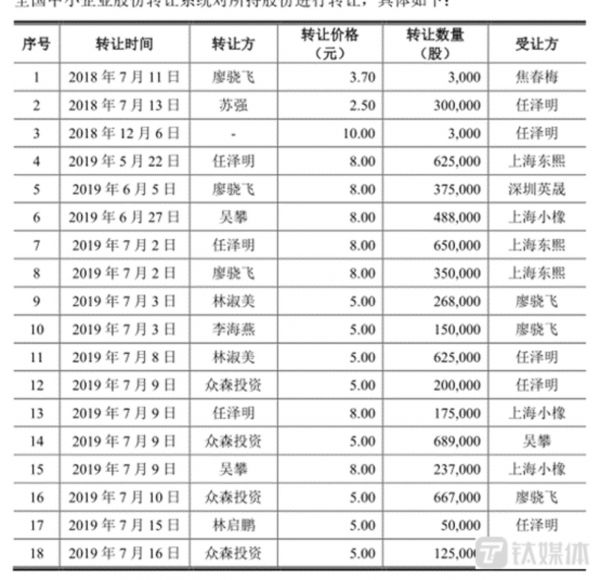 在思泉新材的历史前沿中,2018年7月至2019年7月一年时间内,思泉新材的股权发生了18次转让,而在2019年7月2日至16日,两周时间内每股的转让价格忽高忽低。这段时间的12次股权转让中,有10次涉及到任泽民和廖骁飞(现任思泉新材董事、副总经理),而且任泽民和廖骁飞始终都是以8元/股的价格转让思泉新材的股权,且始终都是以5元/股的价格收购思泉新材的股权。