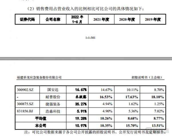 据悉,相较于研发,侨龙应急似乎更热爱营销。招股说明书显示,报告期内,侨龙应急的销售费用分别为2680.83万元、2489.07万元、3827.93万元、1681.82万元,合计约为10700万元;研发费用分别为1094.13万元、1008.08万元、2067.74万元、1117.46万元,合计约为5300万元。换言之,报告期内,侨龙应急在销售上的投入较研发多了5000多万元。另外,除了2022年上半年,其余时间段内侨龙应急的销售费用率也始终高于同行业可比公司平均值。报告期内,侨龙应急的销售费用率分别为13.51%、15.7%、10.35%、10.97%,同行业可比公司平均值分别为8.77%、8.68%、10.26%、19.28%。