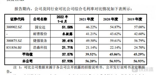 招股说明书显示,报告期内,侨龙应急的研发费用率分别为5.51%、6.36%、5.59%、7.29%,同行业可比公司平均值分别为5.69%、6.67%、9.05%、25.13%;毛利率分别为56.93%、56.93%、56.2%、57.93%,同行业可比公司平均值分别为45.29%、45.06%、39.52%、37.57%。