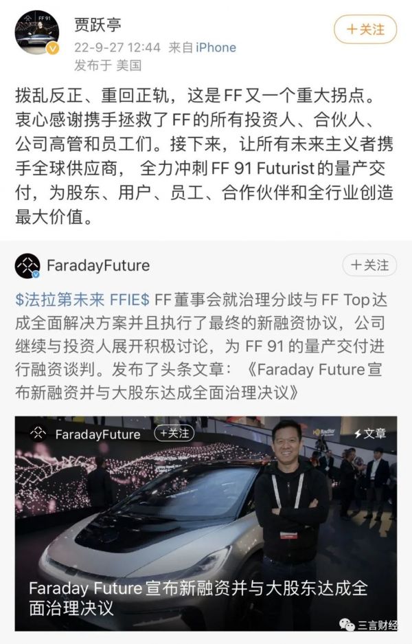 “拨乱反正、重回正轨,这是FF又一个重大拐点”,贾跃亭在社交平台分享了夺回FF控制权的消息。