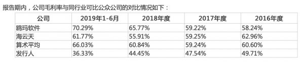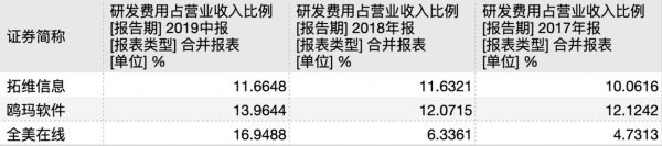 但同时也正因享受客户壁垒和先发优势,公司对技术升级和研发似乎也就没有那么上心。2017年至2019上半年,公司研发费用分别为2467.52万元、3825.77万元和2805.78万元,占营收比例分别为4.73%、6.34%和16.95%。而与同行横向对比,拓维信息、鸥玛软件的研发投入均占营收10%以上,全美在线在2018年前均与同行相差甚远。