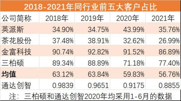 2018-2020年和2021年1-6月,通达创智营收为分别为5.32亿元、5.83亿元、6.93亿元、4.85亿元,归属于母公司所有者的净利润分别为6340.1万元、4131.32万元、9023.35、6891.27万元。其中,公司向前五大客户销售的总金额分别为4.71亿元、4.68亿元、5.44亿元和3.53亿元,占当期营业收入的比重别为 98.39%、96.51%、91.75%和 88.55%,这一比例高于行业平均水平。