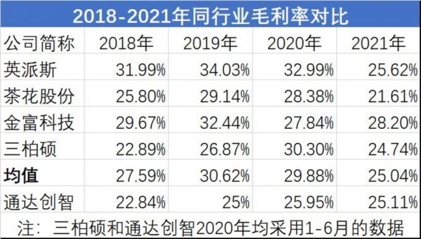 钛媒体APP注意到,在相同模式下,通达创智的毛利率却在大多数时候低于行业平均值。
