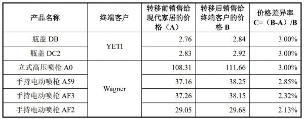 钛媒体APP注意到,Wagner 的手持电动喷枪A59、手持电动喷枪 AF3、手持电动喷枪 AF2 三个产品的价格差异率与3%有一定出入。公司解释称是主要是因为 2019 年美国加征关税的影响,Wagner 与发行人进行协商,对部分产品进行价格调整所致。