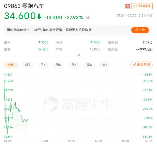 早在昨日的暗盘交易中,零跑汽车就收跌13.96%,报41.3港元。
