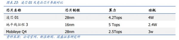 首先是在芯片上,目前蔚小理的最新车型都已经用上了英伟达的Orin,7nm工艺,算力达到254TOPS。从芯片角度来说,地平线征程5也已经用上了14nm制程,算力达到128TOPS。但零跑凌芯01目前用的还是28nm制程,对标的还是行业上两代的产品地平线征程3和Mobileye Q4。