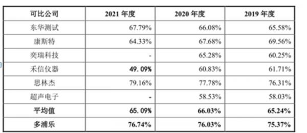 2019年-2021年,多浦乐分别实现营业收入9656.52万元、12788.63万元、14994.39万元,净利润分别为3362.73万元、5157.09万元、6422.32万元,业绩呈现持续上述的趋势。多浦乐之所以能实现上述的利润主要是依赖其较高的毛利率。报告期内,多浦乐的毛利率分别为75.37%、76.03%、76.74%,同行业可比公司平均值分别为65.24%、66.03%、65.09%。可以看出,在上述时间段内,多浦乐的毛利率始终高于同行业可比公司平均值至少10个百分点。