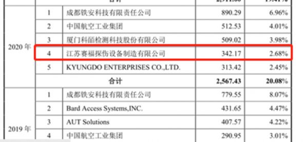 招股说明书显示,2020年,多浦乐向江苏赛福探伤设备制造有限公司(下称“赛福探伤”)产生的销售收入为342.17万元,而赛福探伤也是其第四大客户。