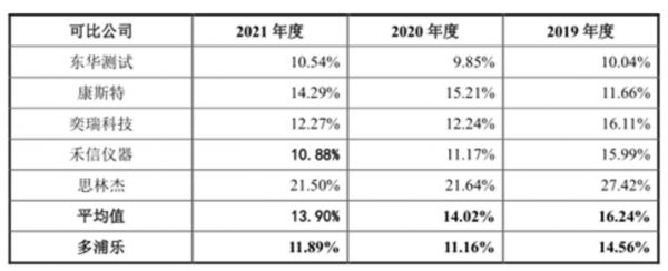 报告期内,多浦乐的研发费用率分别为14.56%、11.16%、11.89%,同行业可比公司平均值分别为16.24%、14.02%、13.9%。