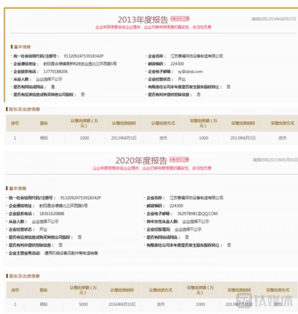 钛媒体APP查询国家企业信用信息公示系统发现,自2013年起到2020年末,赛福探伤的实缴资本均为1000万元。