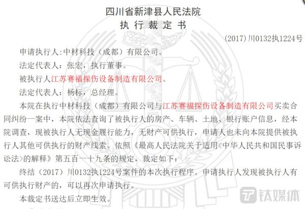 与此同时,中国裁判文书网显示,四川省新津县人民法院查询了赛福探伤的房产、车辆、土地、银行账户信息,赛福探伤无现金履行能力,无财产可供执行。