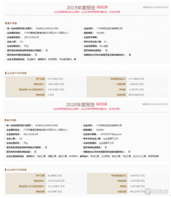国家企业信用信息公示系统显示,2019年和2020年,坤发五金的营业总收入分别为138.13万元、133.97万元,净利润分别为-3.38万元、-1.21万元,所有者权益分别为57.77万元、-24.42万元。
