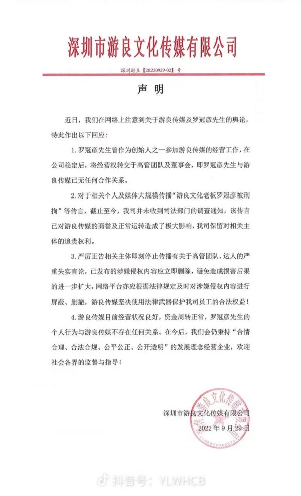 9月29日,游良传媒发布官方声明,称公司未收到司法部门的调查通知。同时,公司撇清了与创始人罗冠彦的关系,称罗冠彦已将经营权转交高管团队及董事会,目前与游良传媒已无合作关系。