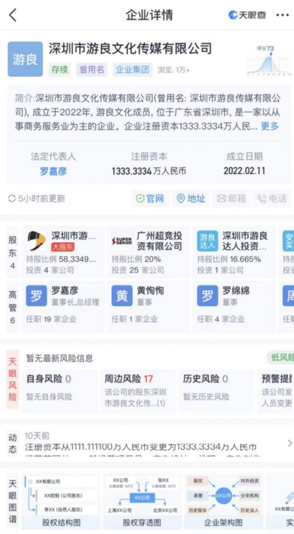 尽管游良传媒在抖音官方声明中表示,罗冠彦已与公司“无合作关系”,但工商资料显示,罗冠彦的兄弟罗嘉彦,依然是公司的法定代表人。