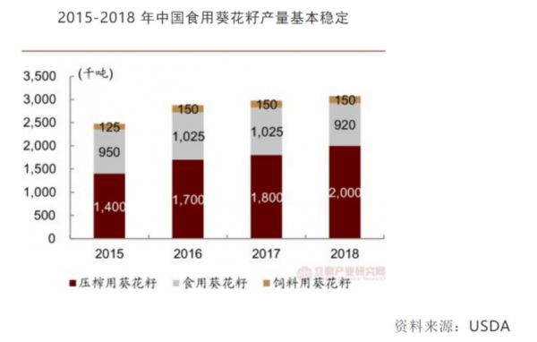 从行业情况来看,食用葵花籽市场也早已不是“蓝海”。根据美国农业部数据显示,近年来中国食用葵花籽产量总体保持稳定,2015-2018 年产量在 90-100 万吨,2019 年包装葵花籽市场规模约 97亿元。