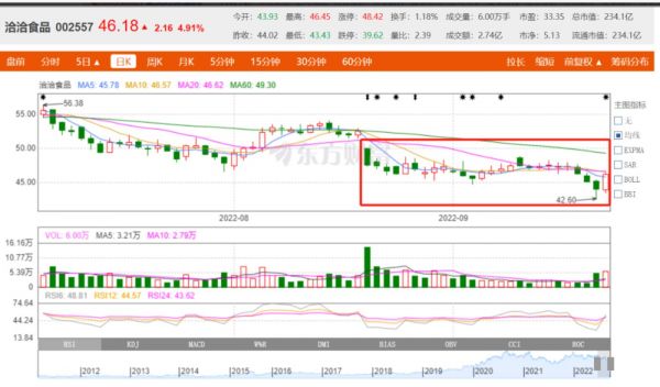 但这份看似“优异“的成绩单却未能打动投资人的心,在财报发布当日(8月19日),洽洽食品股价迅速走低,盘中一度触及跌停,发布财报当日洽洽食品收盘价为47.5元,跌幅达9.7%。而后,洽洽食品股价波动下跌,即使9月26日小幅回调,当日股价上涨4.91%,也仍未能扭转下跌态势,相对财报发布前,洽洽食品股价已经下跌13.9%。