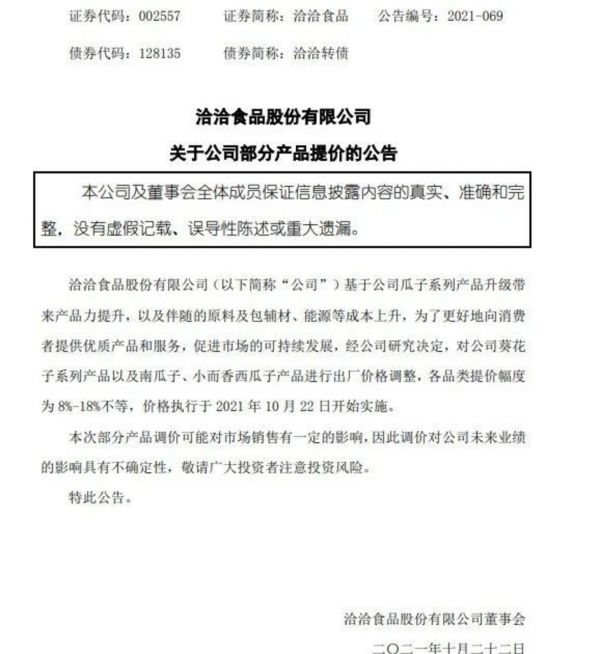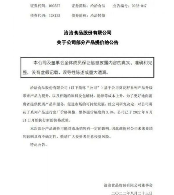 2022年8月24日,洽洽食品发布提价公告称,基于公司葵花籽系列产品升级带来产品力提升,以及伴随的原料及包辅材、能源等成本上升,为了更好地向消费者提供优质产品和服务,促进市场的可持续发展,经公司研究决定,对公司葵花籽系列产品进行出厂价格调整,整体提价幅度约3.8%。公司已于2022年8月21日开始执行新的价格政策。