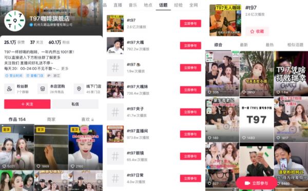 如果直播内容足够出圈,可以帮助品牌快速打响名号,缩短品牌建设周期,如T97咖啡,相关抖音话题播放量已达到2.6亿次,这对于一个初创一年的咖啡品牌,一定程度上在观众面前“刷个脸熟”。