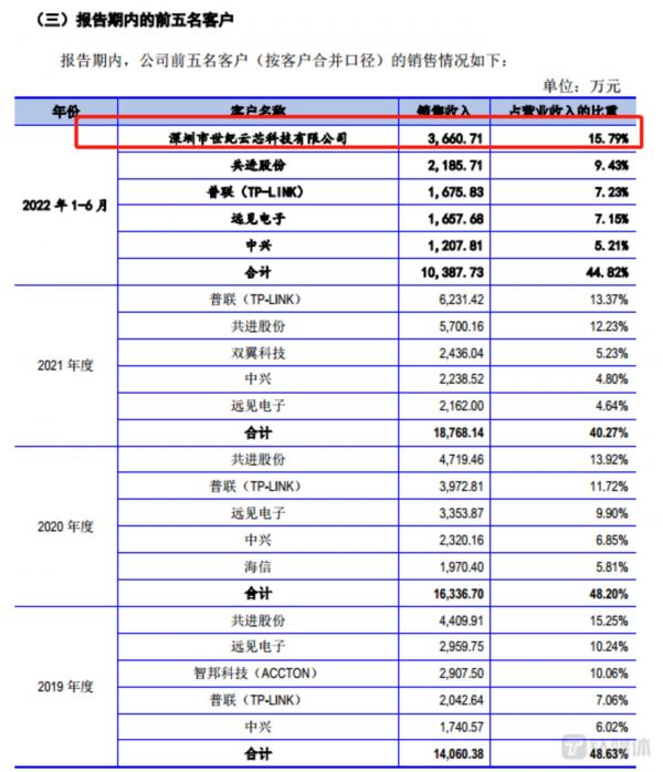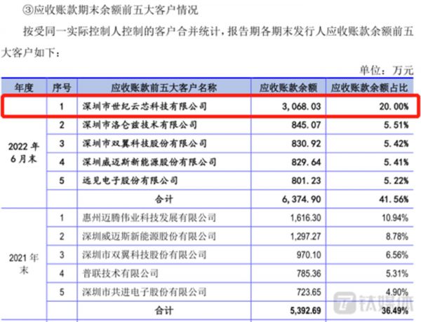 招股说明书显示,2022年1-6月,美信科技向深圳市世纪云芯科技有限公司(下称“云芯科技”)产生的销售收入为3660.71万元,而云芯科技也位列美信科技的第一大客户。