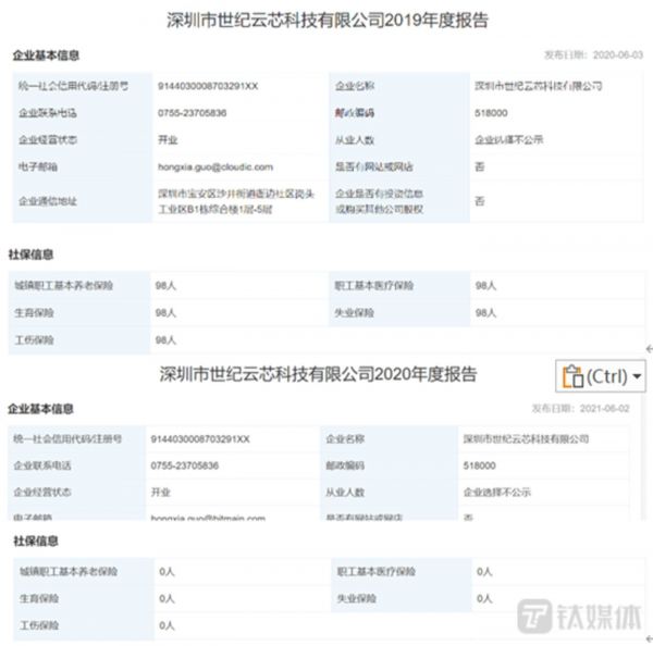 与此同时,天眼查显示,云芯科技2019年-2021年,其缴纳社保的员工人数为98人、0人、0人。为何云芯科技在2020年开始就不为员工缴纳社保?若是经营不理想,为何2022年上半年,云芯科技要向美信科技采购3660.71万元的产品?
