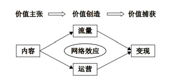 内容、流量、运营和变现四个概念遵循着“价值主张→价值创造→价值捕获”的商业模式维度关系。