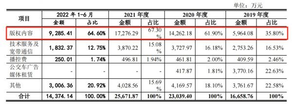 报告期各期内,公司版权内容成本分别为5964.08万元、14262.18万元、17276.29万元及9285.41万元,占主营业务比重分别为35.80%、61.90%、67.30%和64.60%,金额及占比均呈上升状态。2020年、2021年,其版权内容成本较上年分别大幅增长139.09%和21.13%。