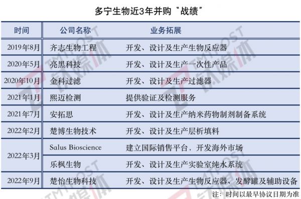 根据招股书,从2019年8月开始,多宁生物先后收购及整合了齐志生物工程、亮黑科技、金科过滤、熙迈检测、安拓思、乐枫生物、楚博生物技术、Salus Bioscience及楚怡生物科技,将公司从国产化无血清培养基及新型一次性使用耗材平台发展成了一站式供应平台。