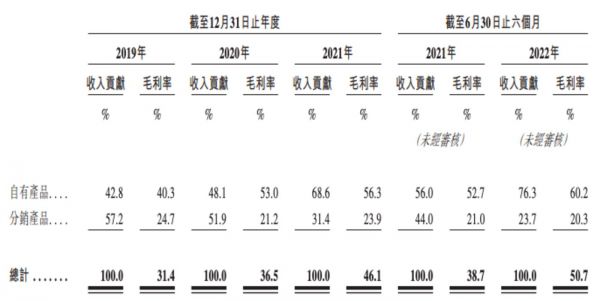 自有产品毛利率较高,这也带动了公司整体毛利率的上升,从2019年的31.4%增至2022年H1的50.7%。