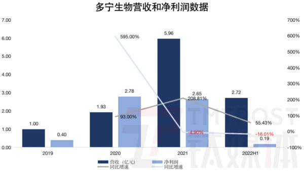 招股书显示,2019年至2021年,多宁生物收入分别为9971.5万元、1.93亿元和5.96亿元,2022年上半年,其收入为2.72亿元,同比增长55.43%,不及此前翻倍增长。