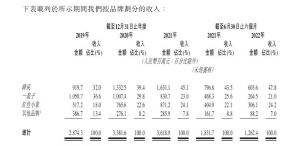 招股书中显示,上美集团目前在多个品牌下提供护肤品、母婴护理产品、洗护用品等品类丰富的化妆品,主要包括韩束、一叶子和红色小象三个品牌。但主要收入也来自该三个品牌,于2019年、2020年、2021年及截至2022年6月30日止六个月,分别贡献总收入的86.6%、91.8%、92.2%及93%。为应对消费者对优质功能产品的需求增加,上美集团也推出了高肌能、安弥儿、极方等这些新品牌,用以拓宽敏感肌肤、中高端孕肌护理和护发产品类别的产品范围。