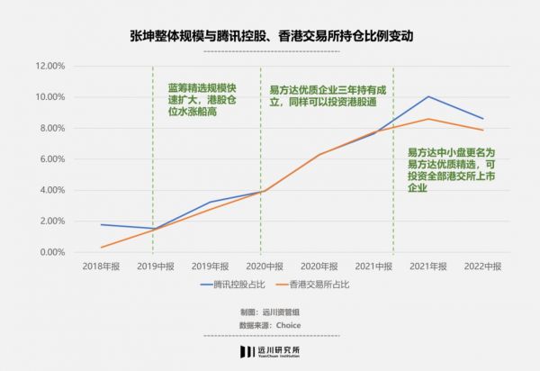 从2017年底,易方达亚洲精选就一直重仓持有腾讯与港交所。2018年蓝筹精选成立,其港股仓位中这两只个股也长期重仓配置。但由于这两个基金在当时规模不及易方达中小盘,所以在张坤的整体规模中占比较低。