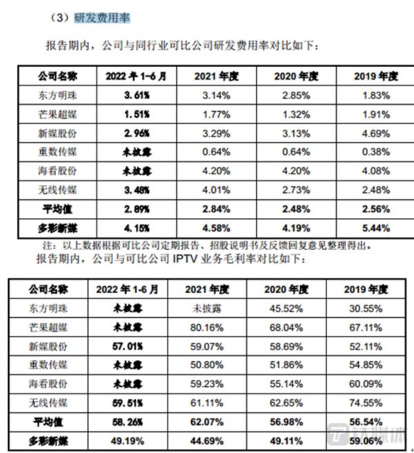招股说明书显示,报告期内,多彩新媒的研发费用率分别为5.44%、4.19%、2.84%、4.15%,同行业可比公司平均值分别为2.56%、2.48%、2.84%、2.89%,多彩新媒的研发费用率始终高于同行业可比公司平均值。与此同时,多彩新媒IPTV的毛利率分别为59.06%、49.11%、44.69%、49.19%,同行业可比公司平均值分别为56.54%、56.98%、62.07%、58.26%。2019年-2021年,多彩新媒的毛利率持续下降,且在研发费用率始终高于同行业可比公司平均值的情况下,其毛利率的走势还完全与同行可比公司平均值相反。