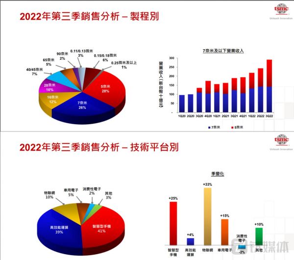 制程销售方面,台积电5nm半导体出货量占总营收的28%,7nm占比达26%,16nm占比达12%,共计占比达66%。魏哲家表示,受手机、个人电脑等部分客户需求下滑影响,四季度7nm及6nm制程投片递延,产能利用率预估需要数个季度时间回到过去水平,这种情况会持续到2023年上半年。