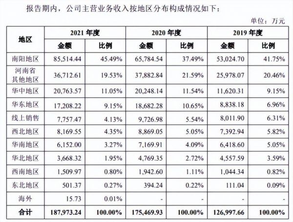 据招股书显示,2019-2021年,想念食品在南阳地区的营收分别为5.30亿元、6.58亿元以及8.55亿元,占主营业务的比重分别为41.75%、37.49%以及45.49%,而在河南省其他地区的营收占比均在20%左右,两者合计占比在60%-70%。但在河南省以外的其他地区如华北、西北、华南、东北等地的销售收入均不超过6%。可见河南地区在想念食品营收中占据十分重要的地位。