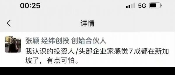 经纬创投创始合伙人张颖也曾在朋友圈证实了这一消息,“我认识的投资人、头部企业家感觉7成都在新加坡,有点可怕。”