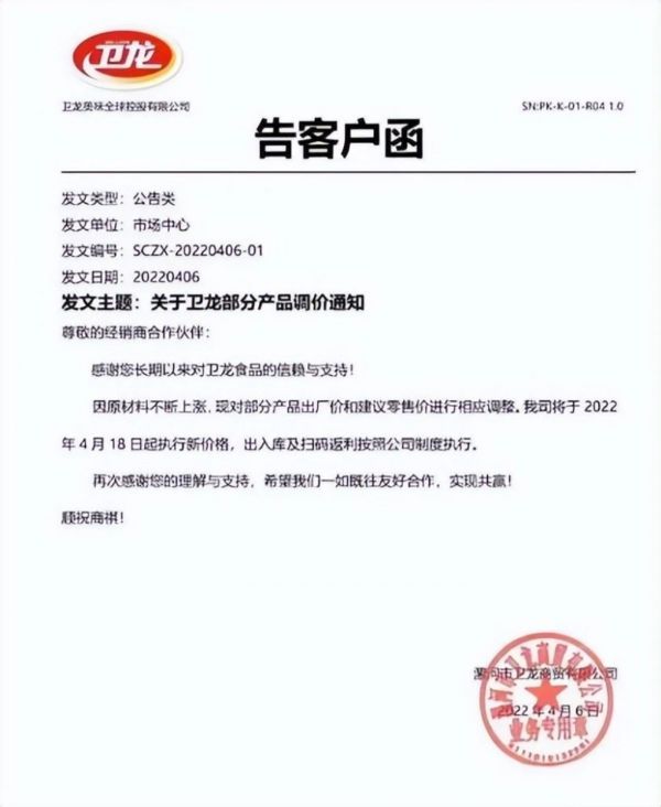 今年4月,在IPO之前,卫龙再次对其产品进行了两次提价。对此,卫龙的解释是,为了应对生产中所用若干原材料的采购价格上涨,是产品全线升级、经营战略调整的一部分。
