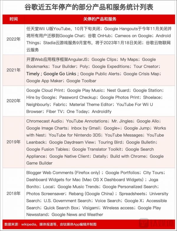 与此同时,谷歌突然宣布关停云游戏Stadia业务,成为过去二十年谷歌关停上百款产品与服务之一。根据钛媒体App的不完全统计,近五年,谷歌关停了83款技术产品或服务。