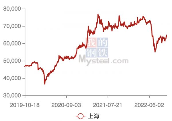 根据我的钢铁网的数据,今年年初至6月中旬,电解铜(阴极铜一般指电解铜)价格持续在高位震荡运行,但随后迅速向下,直到7月中旬才有所反弹。10月18日,上海电解铜价格63500元/吨,相较于2021年12月31日的69880元/吨的价格,跌幅为9.13%。较之2021年前的数据,电解铜依然处于相对高位。